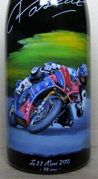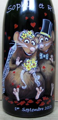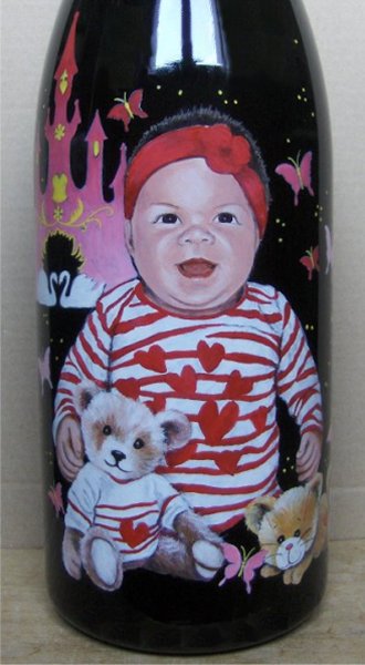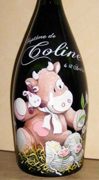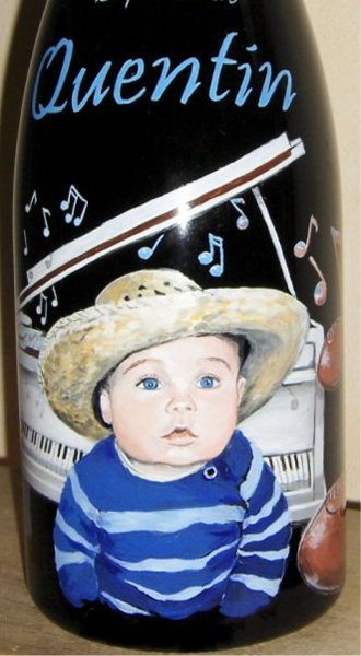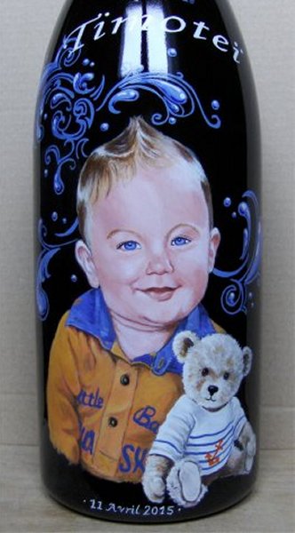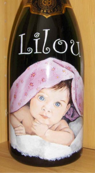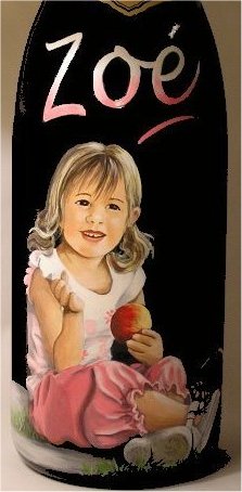 Ainsi,vous pouvez voir plusieurs exemples de portraits d'enfants réalisés d'après photos,sur des bouteilles de champagne.Vous pouvez voir également, des sujets sur le thème du mariage, quelques paysages, et également quelques bouteilles peintes sur le thème du sport.