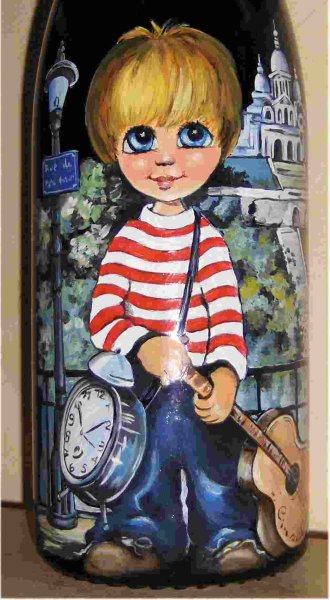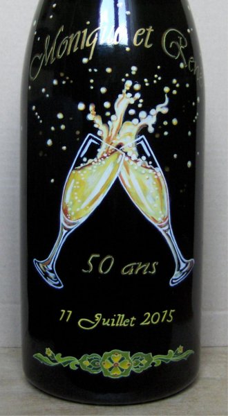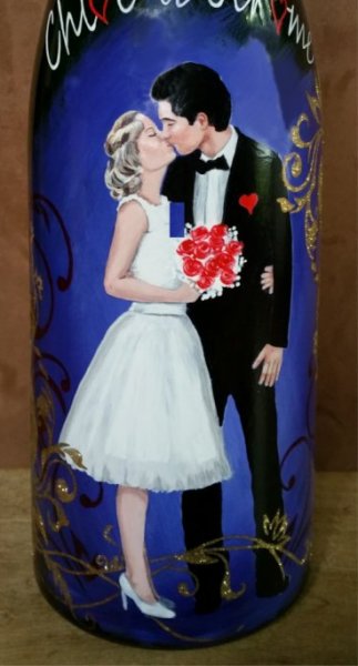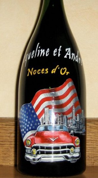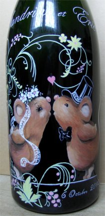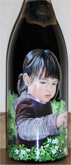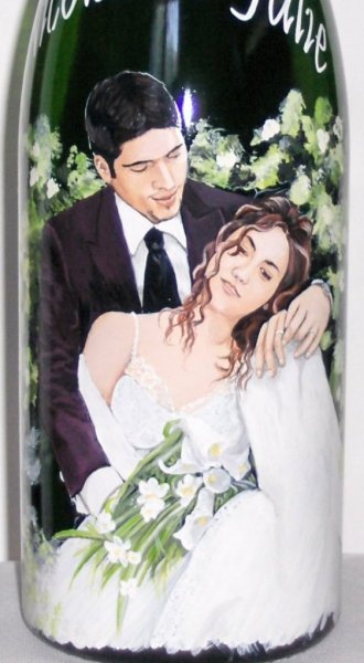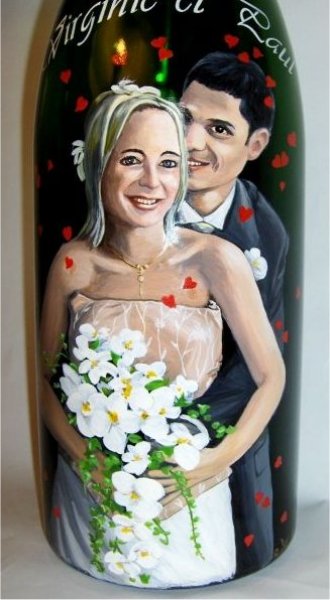 Ainsi,vous pouvez voir plusieurs exemples de portraits d'enfants réalisés d'après photos,sur des bouteilles de champagne.Vous pouvez voir également, des sujets sur le thème du mariage, quelques paysages, et également quelques bouteilles peintes sur le thème du sport.